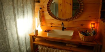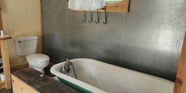 Two tubs, and an outdoor and indoor shower make sharing the space comfortable for all.