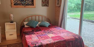 This bedroom has a full-sized mattress and an en suite bathroom.